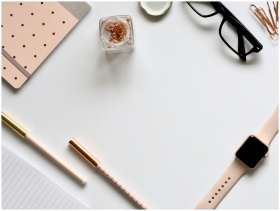 Stylish rose gold themed flatlay featuring office supplies and a smartwatch on a white background.