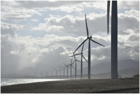 A row of wind turbines along a cloudy beach shoreline in Vigan City, Philippines.