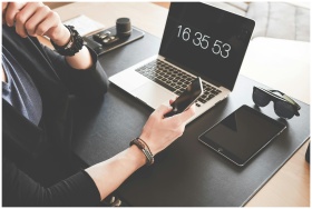 A modern workspace featuring a laptop, smartphone,