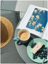 A cozy outdoor setup with coffee, berries, and a book, perfect for relaxing days.