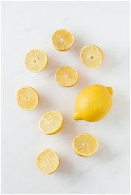 A flat lay of whole and sliced fresh lemons on a clean marble surface.