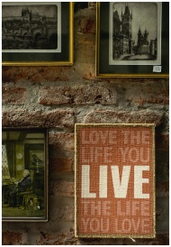 Art and frames adorn a rustic brick wall, featuring an inspirational quote on the canvas.