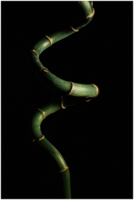 A close-up of a green spiral bamboo plant against a black background.