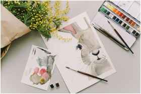 A creative flatlay featuring watercolor paintings of an Easter bunny with mimosa flowers and art supplies.