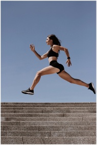 Energetic woman in active wear jumping on stairs o