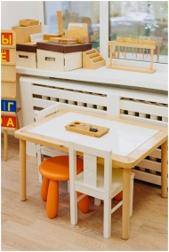 Bright kindergarten classroom featuring a wooden table, chairs, and educational toys.