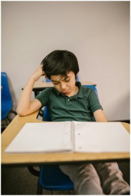 A young boy sits alone at a desk, looking sad and