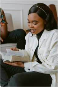 Smiling young woman engaged in reading a bible ind