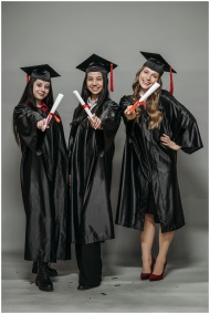 Three women in graduation gowns celebrating with diplomas, smiling proudly.