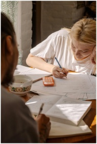 A woman writes in a notebook at a café table with
