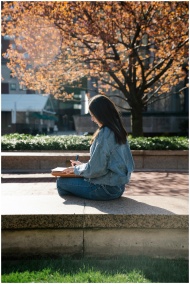 A young woman in casual attire writes in a notebook while sitting on a ledge in a park during a sunny day.