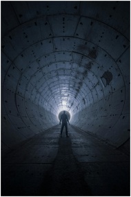 A silhouetted man stands in a dark tunnel, evoking mystery and intrigue.