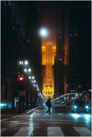 A lone figure crosses a city street at night, illuminated by a glowing skyscraper.