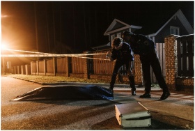 Police officers investigate a crime scene at night, examining evidence near a residential area.