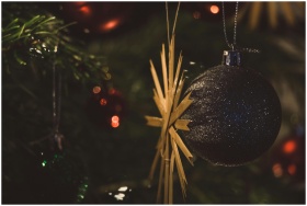 Close-up of a sparkling Christmas ornament with warm bokeh on a festive tree.
