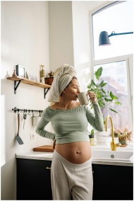 Pregnant woman in kitchen enjoying a hot drink, em