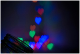 Vibrant heart-shaped bokeh lights in blue, red, an