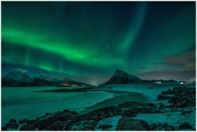 Stunning display of the Aurora Borealis illuminating the snow-covered coast and mountains in Nordland, Norway at night.