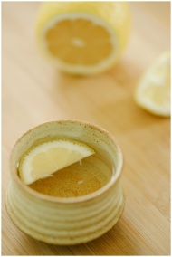 From above of oriental cup of green tea with aromatic juicy lemon slice on wooden table