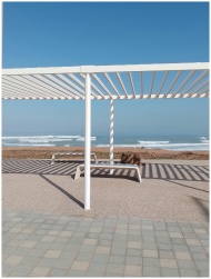 Bright pergola by the seaside in Casablanca, Morocco with clear blue skies.