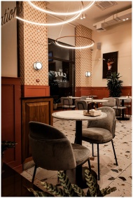 Warm and inviting cafe interior in Yerevan, Armenia with modern furnishings and ambient lighting.
