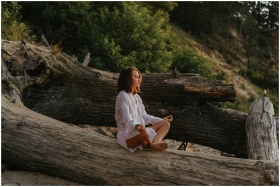 Woman in white shirt meditates on a large log in a forest setting during the day.