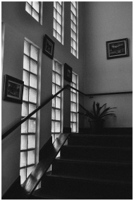 Artistic black and white photo of a modern staircase with glass blocks and framed artwork.