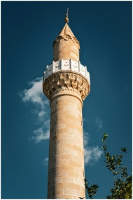 A stunning minaret tower in Muğla, Türkiye, captured against a clear blue sky, showcasing intricate architecture.