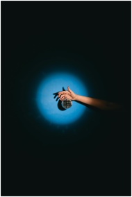 A hand elegantly holding a disco ball against a dark background, highlighted by a blue spotlight.