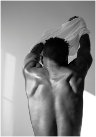 Grayscale image of a shirtless muscular man from behind removing his shirt.