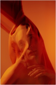 Artistic portrait of a person behind a red translu