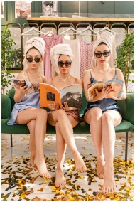 Three women in towels and sunglasses enjoy magazines in a spa lounge, surrounded by confetti.