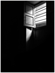 A black and white photo of an open window casting dramatic light and shadows indoors.