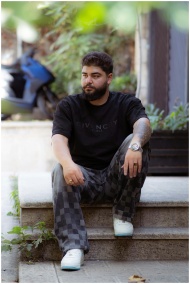 A tattooed man in a cap standing confidently by th
