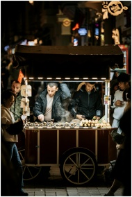 Night scene of a street vendor selling roasted chestnuts from a cart in a crowded market.