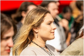 Close-up profile of a bearded man with a bun smili