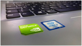 Detailed close-up of a laptop keyboard featuring Intel Core i7 and NVIDIA GeForce stickers, highlighting technology components.
