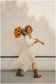 Charming woman with curly hair in a lace dress carries sunflowers, embodying nature's beauty.