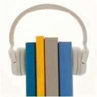 Creative concept of books wearing headphones, symbolizing audiobooks or learning.