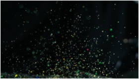Vibrant multicolor paint splatter captured in motion with a dark backdrop, ideal for creative design.