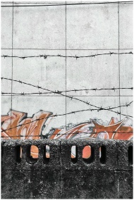 Concrete wall with colorful graffiti and barbed wi
