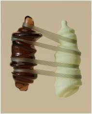 Surreal 3D artwork depicting intertwined abstract shapes with contrasting textures and colors.
