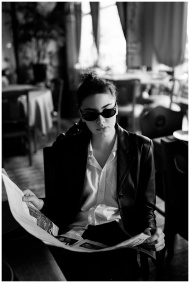 A fashionable woman in sunglasses reads a newspaper inside a cozy café, captured in black and white.