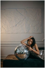 Stylish woman in silver dress posing with disco ball in a modern setting.