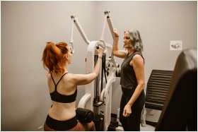 Two women engaged in a workout session using gym equipment, promoting fitness and empowerment.