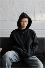 Teenager in a black hoodie sitting on a couch, ref