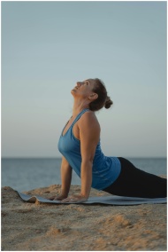 Caucasian woman performing yoga pose on mat by the sea during daytime.