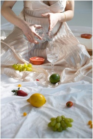 High angle of crop anonymous female in elegant dress pouring water from bottle into glass while sitting on white blanket near scattered assorted fresh fruits