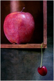 A vibrant red apple and cherry positioned artistically on a wooden shelf.