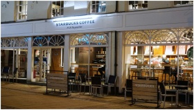 A cozy Starbucks café in Norwich with inviting exterior lights and seating at night.